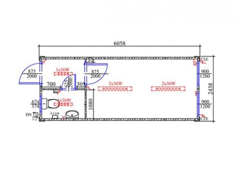 Egy 20 láb hosszú iroda-szaniter konténer alaprajza tipikusan két fő részre oszlik: az iroda és a szaniter részlegre. Az alaprajz leírása a következőképpen nézhet ki: