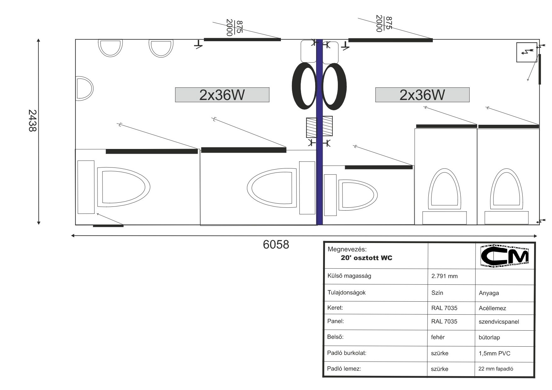 Fesztiválokra, vásárokra, de akár parkokba is alkalmas, ahol el kell különíteni a nemeket. Komfortos, vízre és szennyvízre köthető eszköz. Olyan helyen is alkalmazható, ahol szennyvízre kötési lehetőség nincs, ilyenkor szennyvíztartállyal tudjuk biztosítani az eszközt. A kézmosóknál melegvízet 5 literes átfolyós bojler biztosítja.